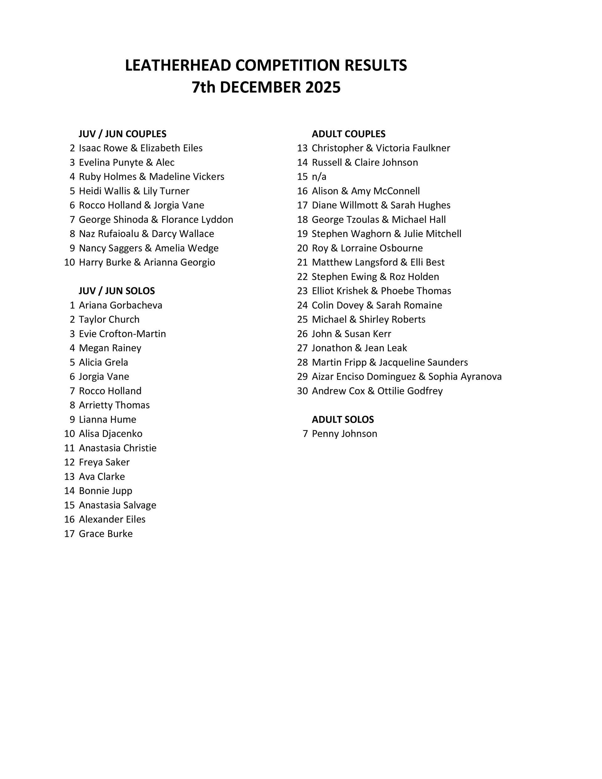 Results from 7th December 25 competition.
